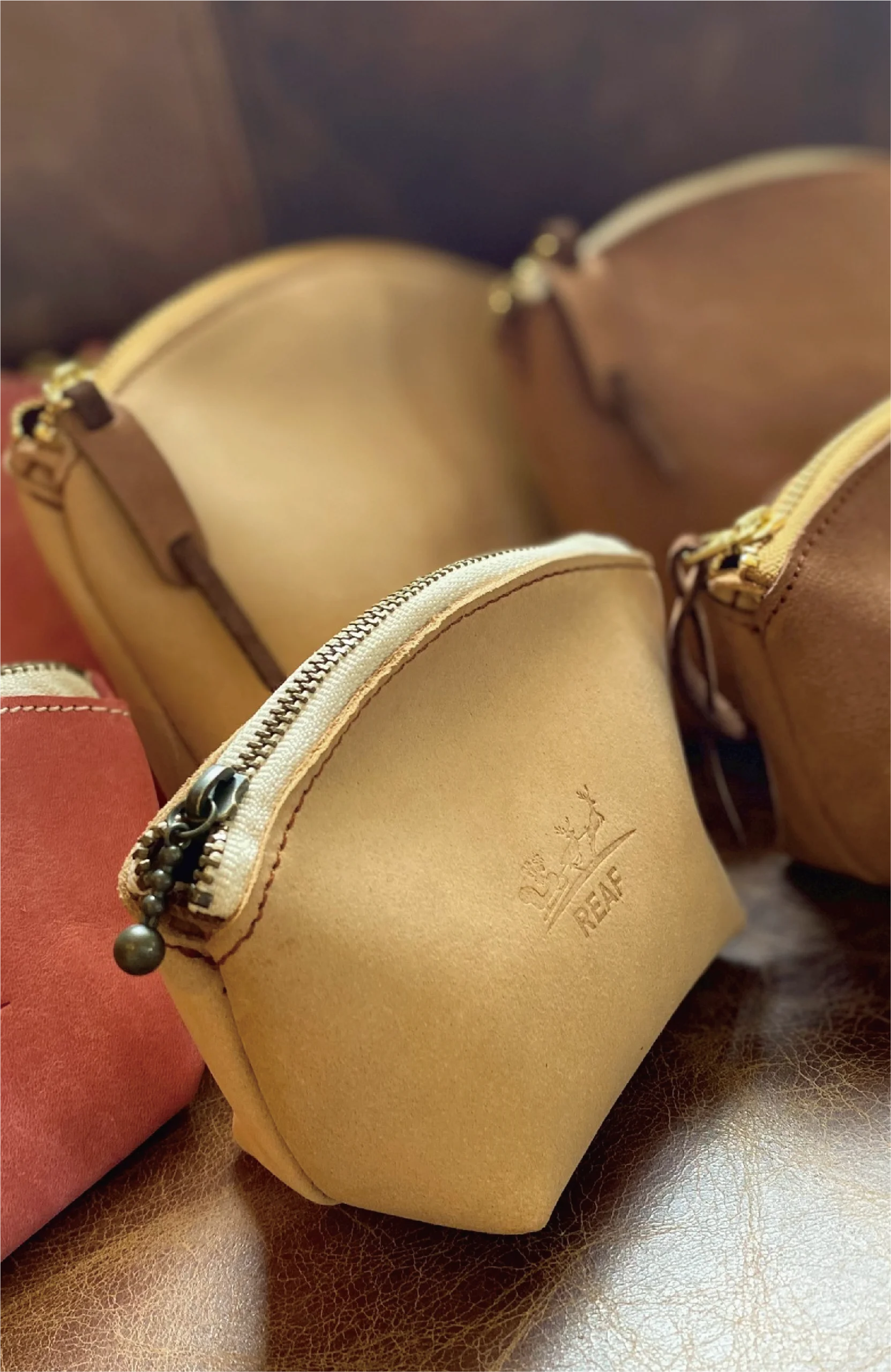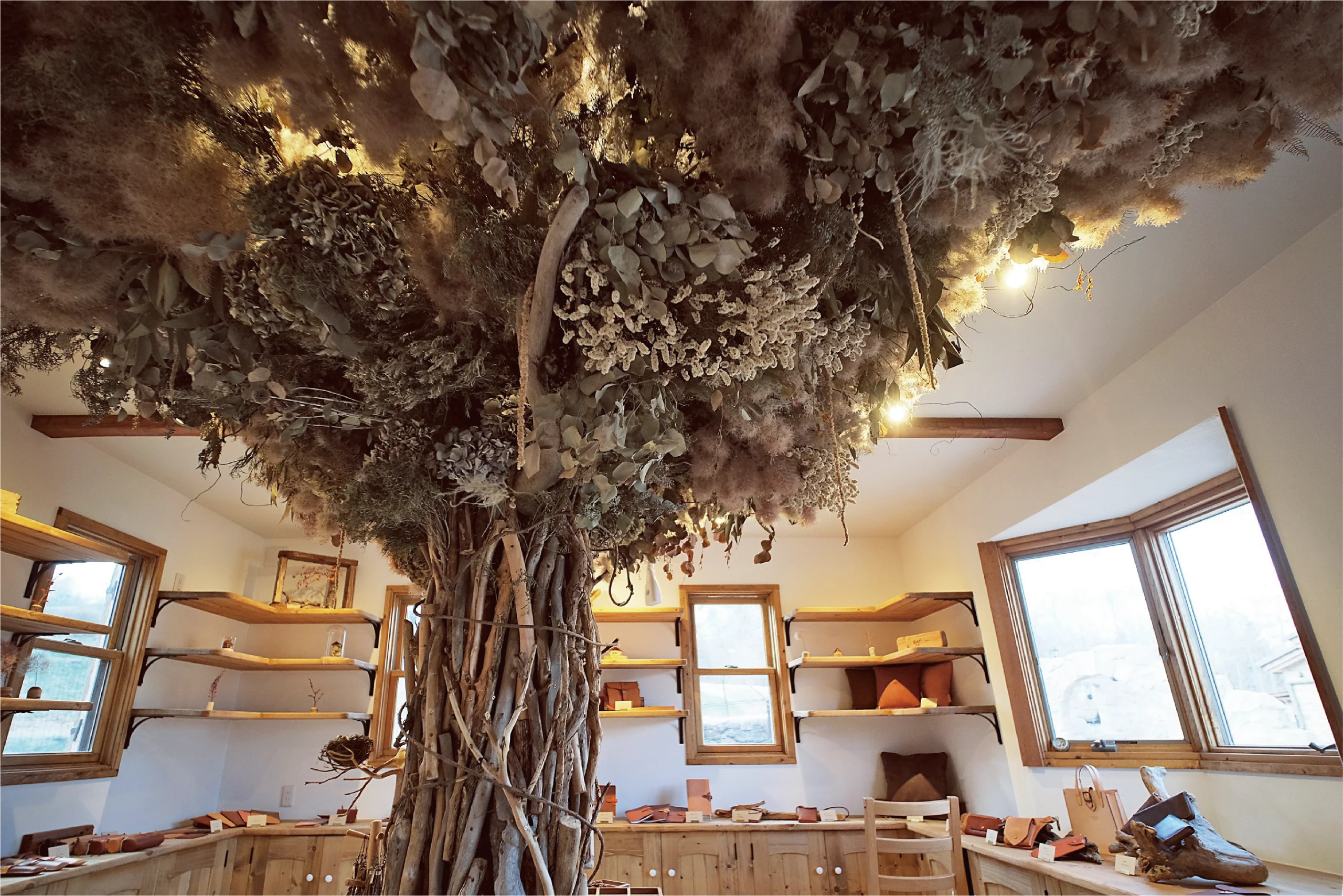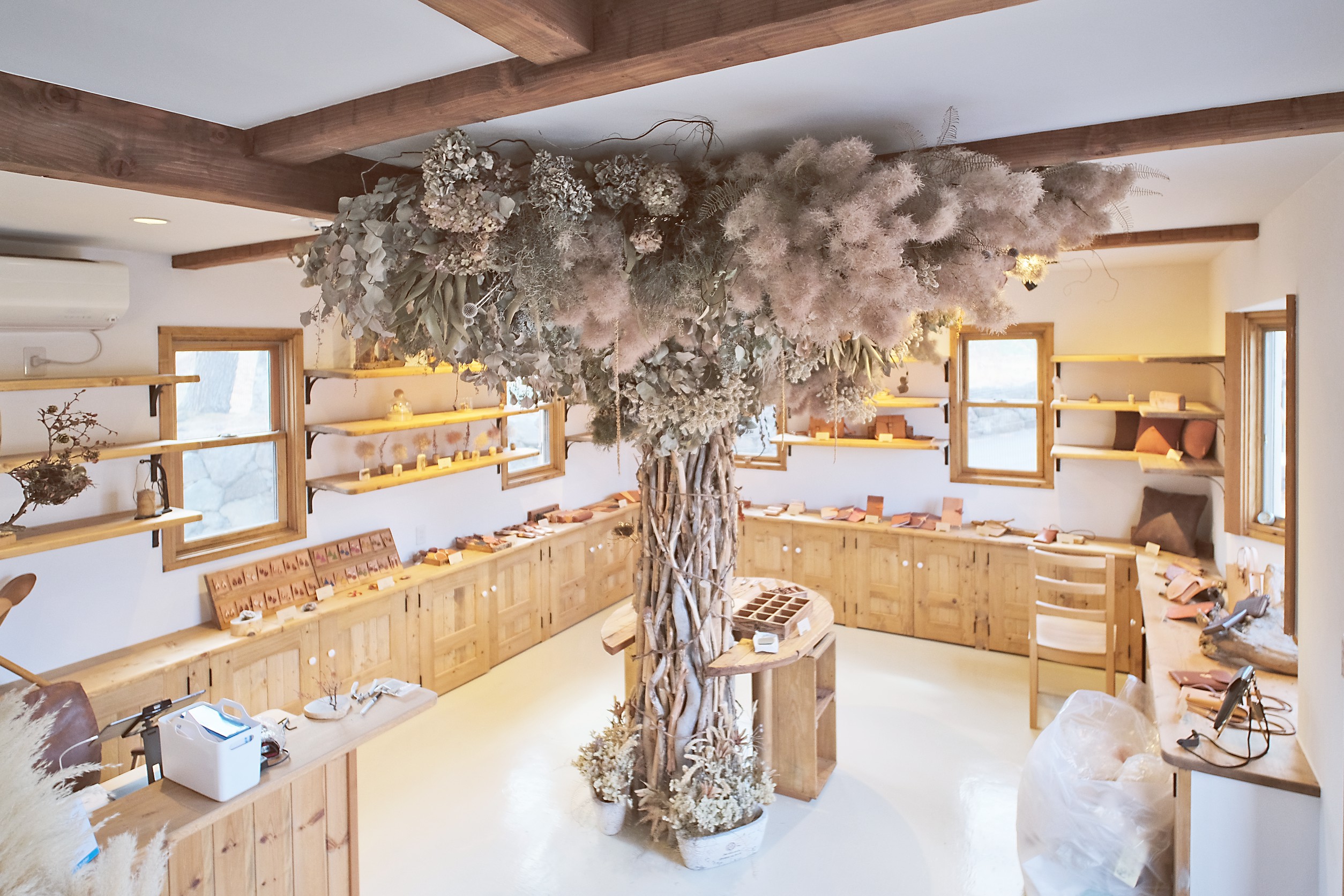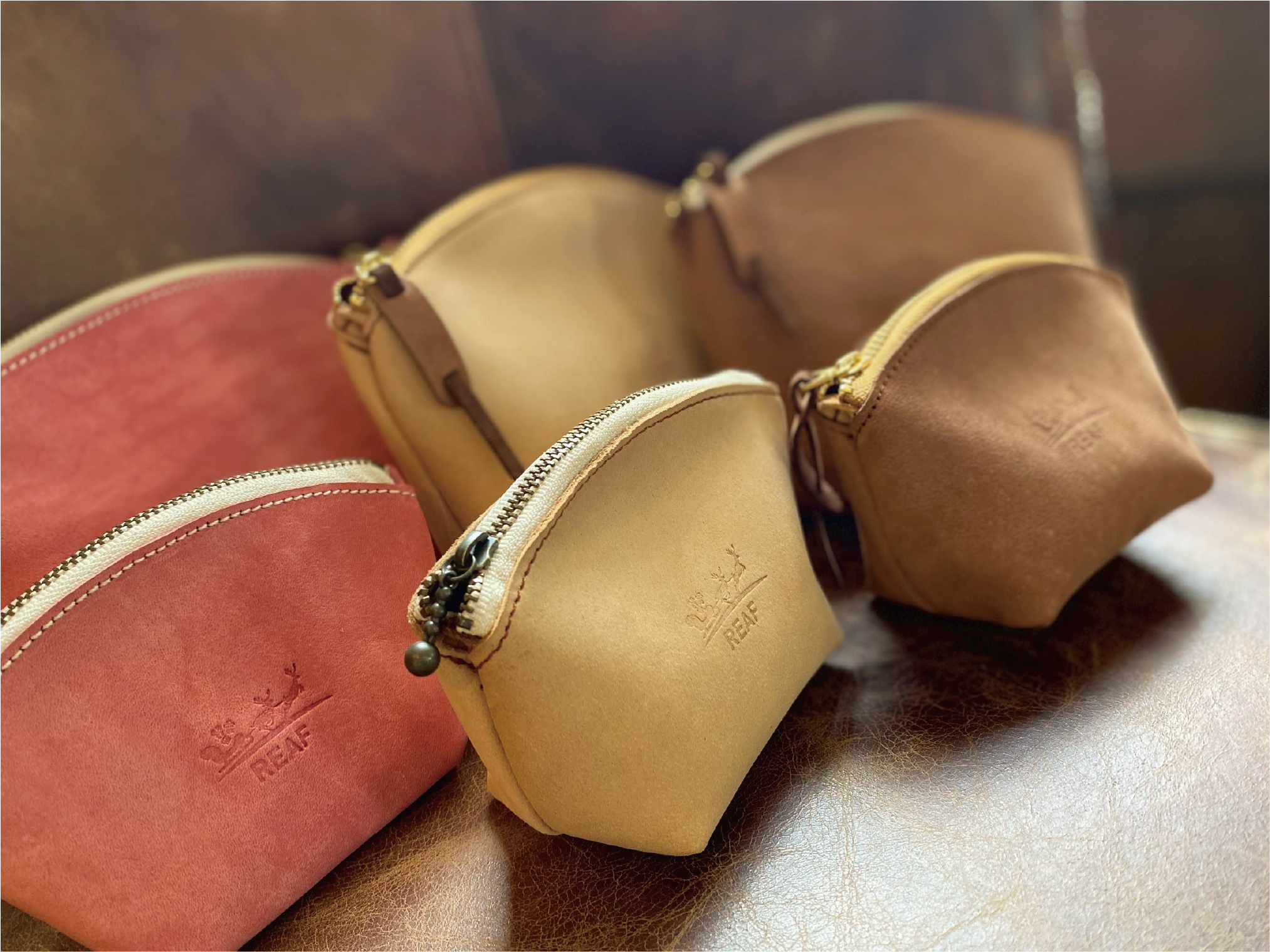 お越し頂いた皆様に自然豊かな環境の中で、木や革などの自然素材を活用したクラフト製品に触れていただける場所をご用意しました。それがREAF SHOPです。